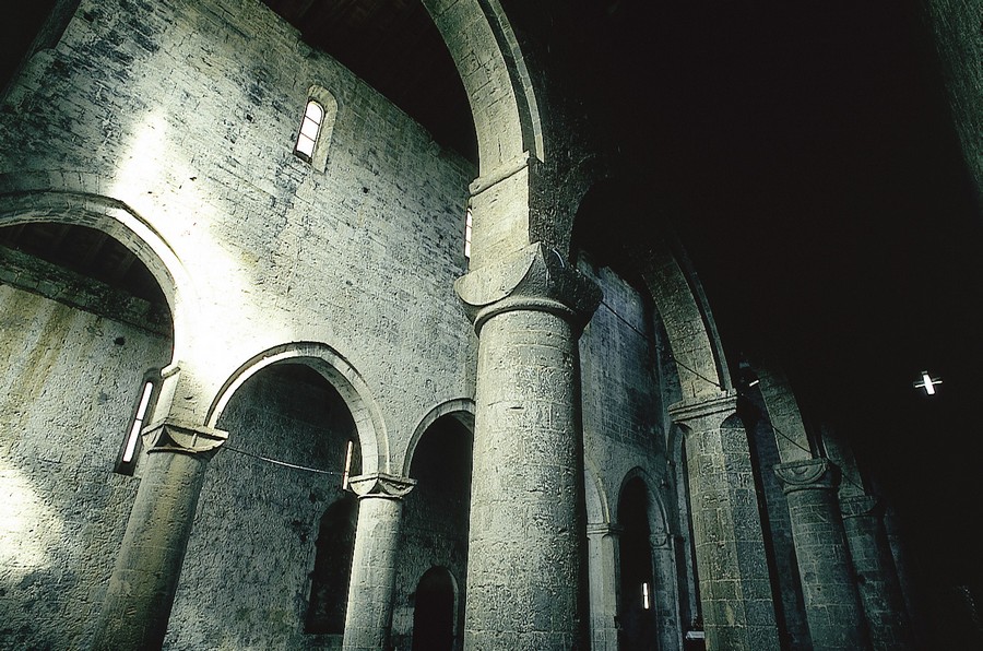 Per contro permane il carattere romanico dell'impianto generale, nel portale strombato (con affresco molto deteriorato nella lunetta), nelle massicce colonne interne in pietra e capitelli cubici istoriati e nella dimensione e distribuzione delle finestre ai lati: tre piccole monofore si aprono infatti solo nella parete nord, in ombra, mentre quella a sud esposta alla diretta luce del sole ne è totalmente priva, lasciando così l'interno in una raccolta penombra nella più classica tradizione romanica.