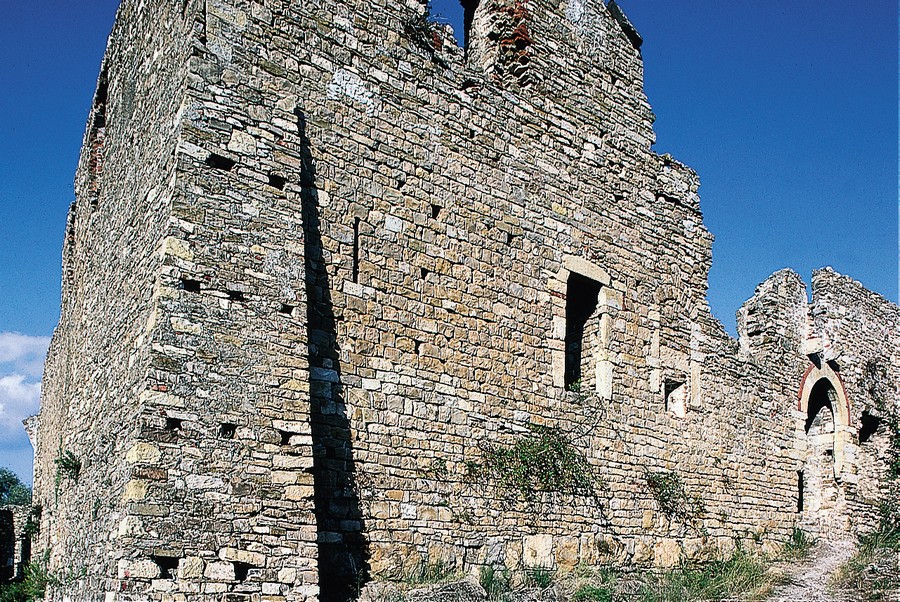 La struttura attorniata da altri ruderi medievali ha pianta poligonale a nord e quadrangolare a sud dove si apre il portale in grossi conci squadrati con arco a sesto acuto.