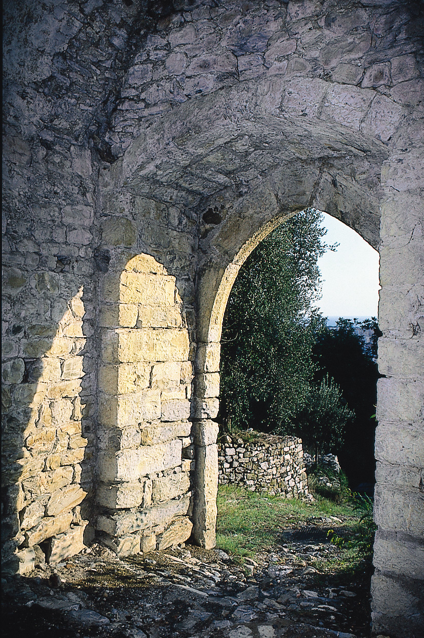 La mulattiera sale verso il castello dei Clavesana e passa attraverso la ben fortificata duecentesca porta-torre ai cui lati si dipartiva la cinta di mura ora scomparsa che proteggeva il sovrastante castello: la diversa tipologia dei due archi in pietra, a sesto acuto quello iniziale e a tutto sesto quello opposto, ci ricordano le incertezze dell'epoca tra gotico e romanico.