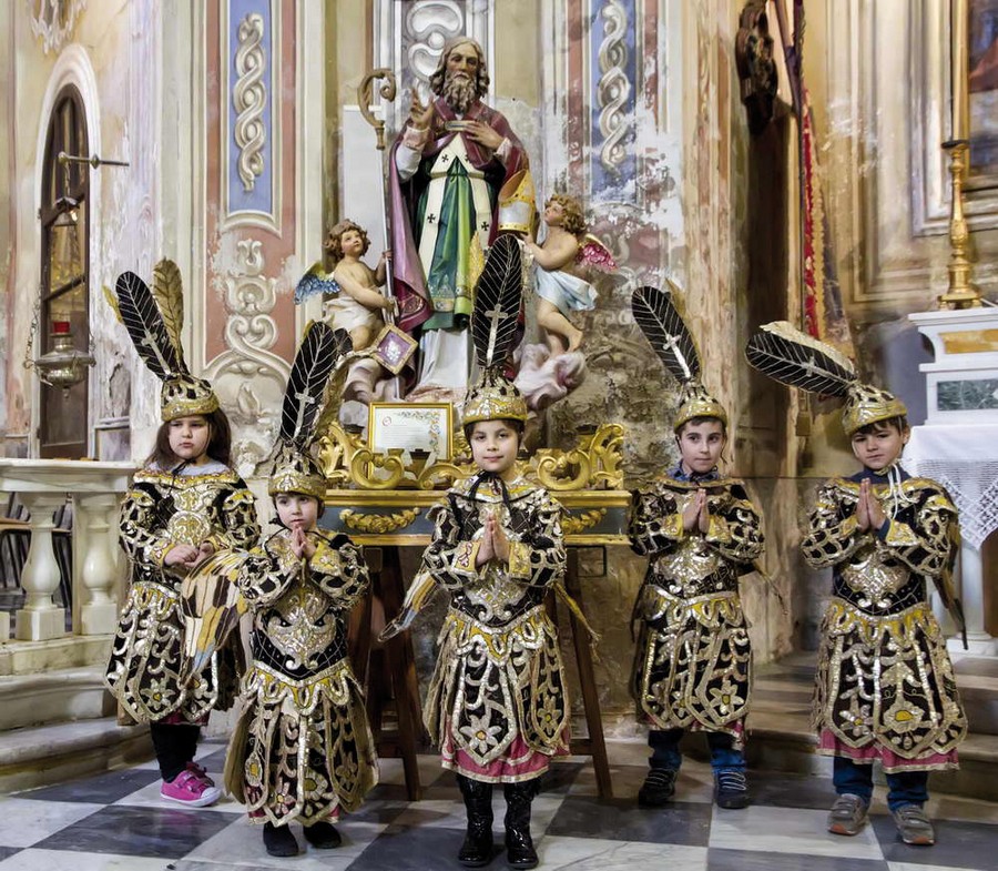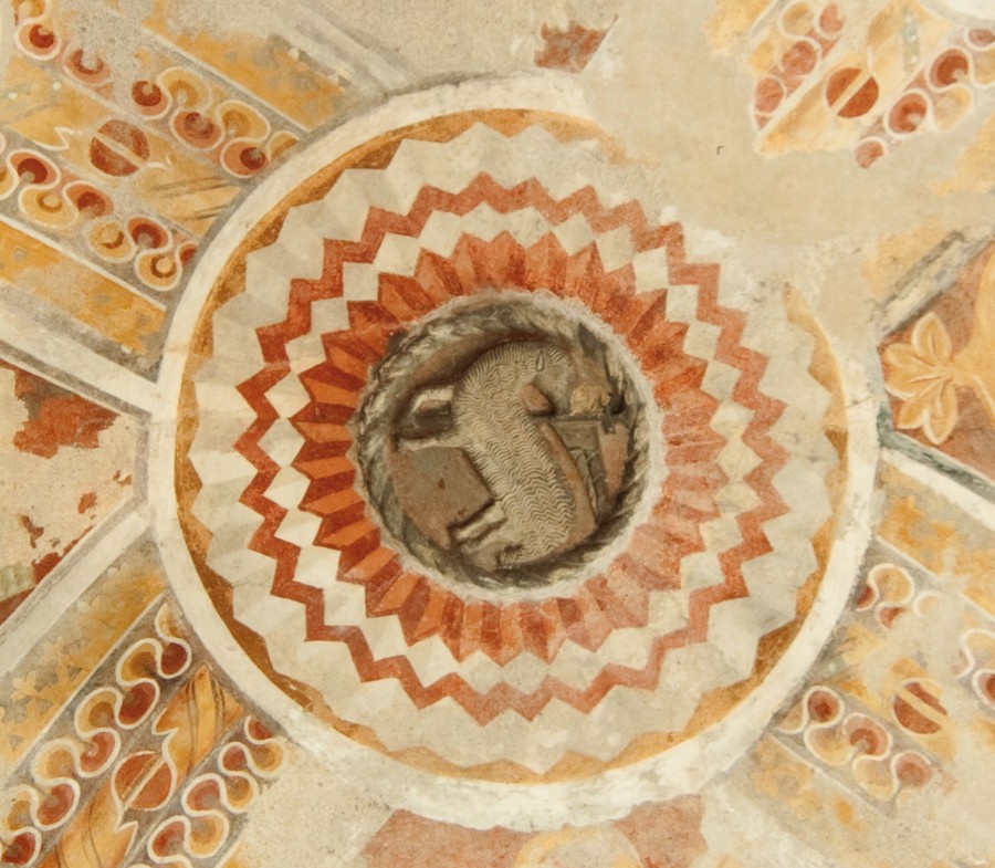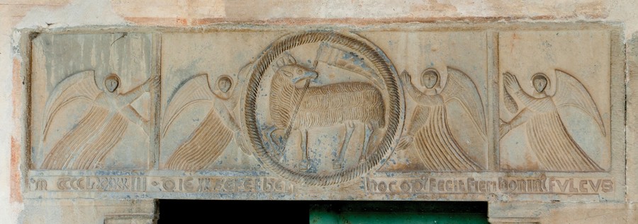 Il porticato, che l'imbecillità di idioti grafomani ha costretto a chiudere con una robusta cancellata, ha volte a crociera di cui quella a destra conserva al centro un tondo in pietra scolpito ad Agnus, si conclude a destra su una mensola in pietra intagliata sotto cui è murata l'originale acquasantiera in pietra, scolpita con la croce di Malta.