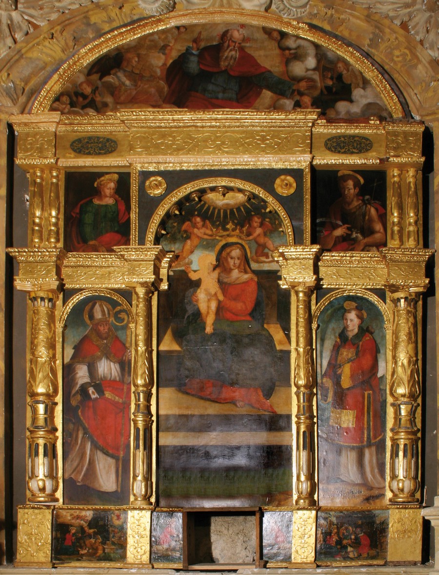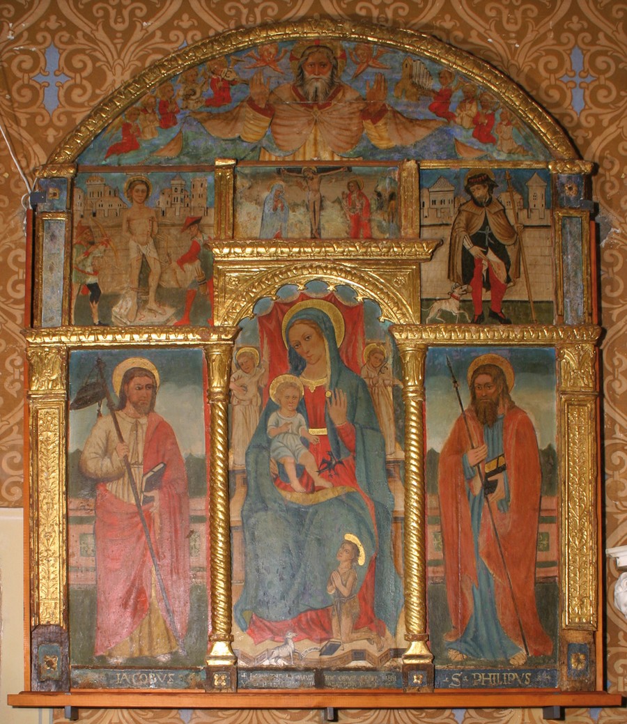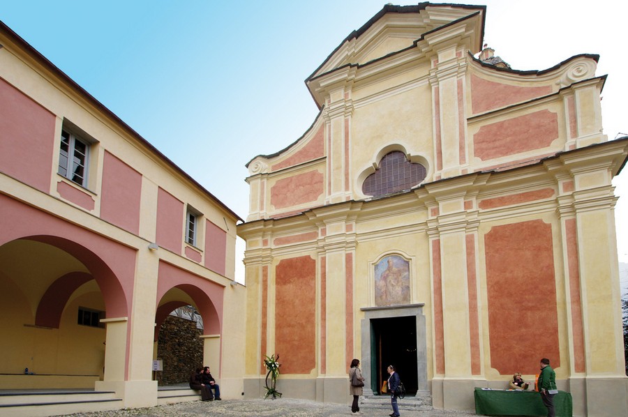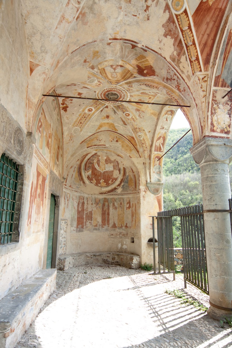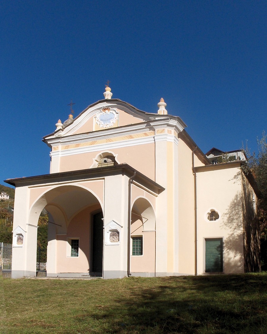 Particolarmente interessante è il porticato che ne protegge il fianco destro, interamente decorato da affreschi attribuiti a Pietro Guidi di Ranzo; pavimentato in ciottoli bianchi e neri, è retto da due colonne in pietra, di cui quella di sinistra ha scolpiti nel capitello maghi custode sormontati da motivi a delicate volute.