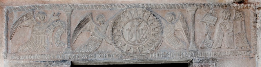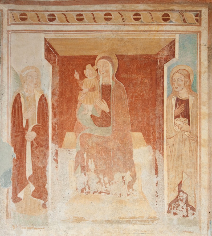 Sulla semplice facciata sono due piccole monofore ora murate ed altre due piccolissime si aprono nelle due tonde abside posteriori.