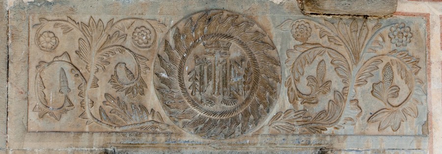 Sotto il porticato si apre a sinistra un primo portale con architrave del 1493 scolpito con Agnus fra angioli stilizzati di sorprendente modernità; sull'adiacente finestra, attraverso cui possiamo vedere l'interno decorato da affreschi di Pietro Guidi di Ranzo , l'architrave è intagliato a Trigramma gotico in tondo con fiamme oblique tra elaborati motivi floreali; il portale di destra infine ha un bassorilievo del 1491 scolpito con al centro Trigramma in un tondo retto da angioli, a sinistra un angiolo con cartiglio e a destra San Pantaleo fra un leggio sormontato da un uccello ed un elaborato inginocchiatoio.