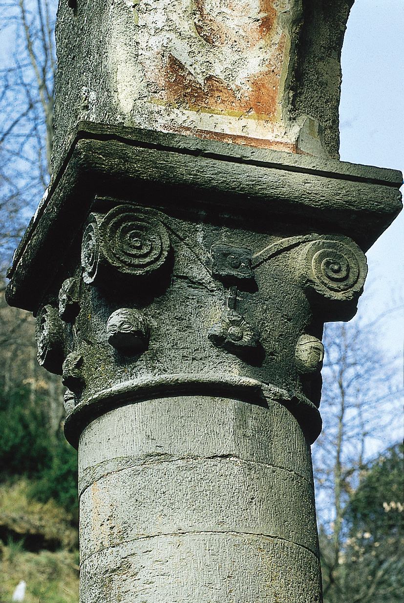 A far guardia sul ciglio della strada ci pensano altri maghi custode, intagliati nel capitello della colonna, più grande ma per il resto identica alle altre, qui sistemata.