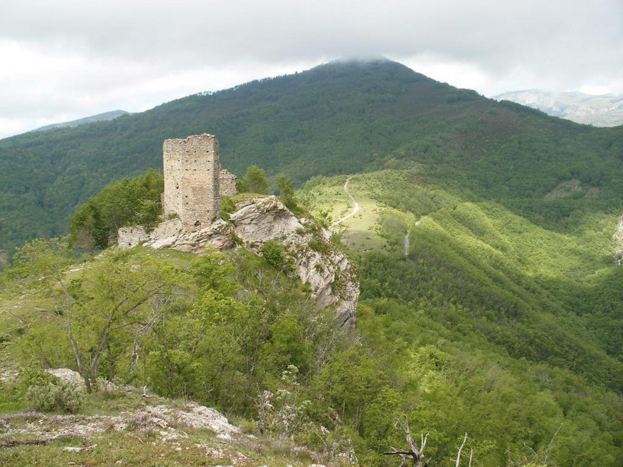 Continuando a salire oltre Aquila d'Arroscia vediamo, alti di fronte a noi, i ruderi del suo castello che dai loro 827 metri di quota dominano ancora le vallate dell'Arroscia e del Pennavaira; della poderosa costruzione restano oggi quattro lati della torre poligonale decapitata e mura con resti di merlature.