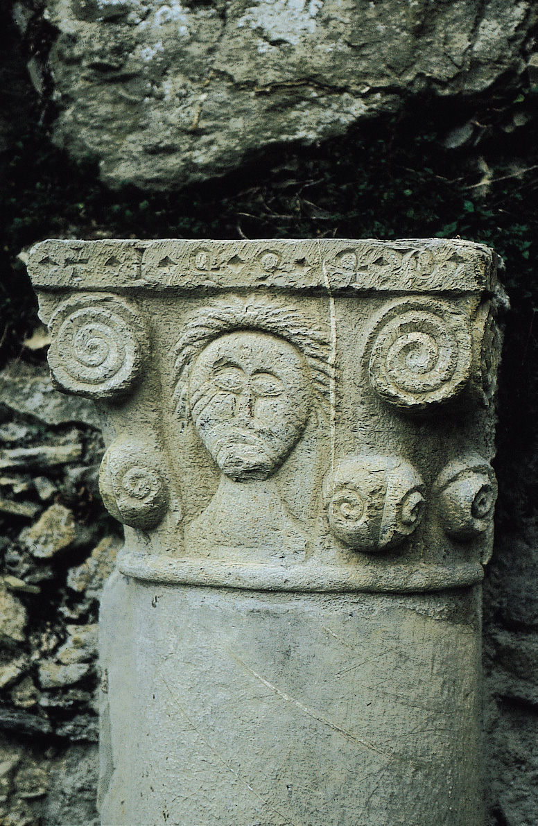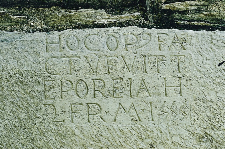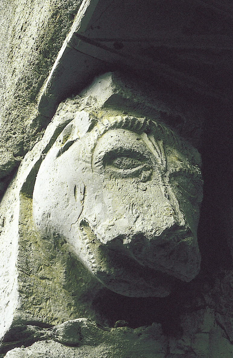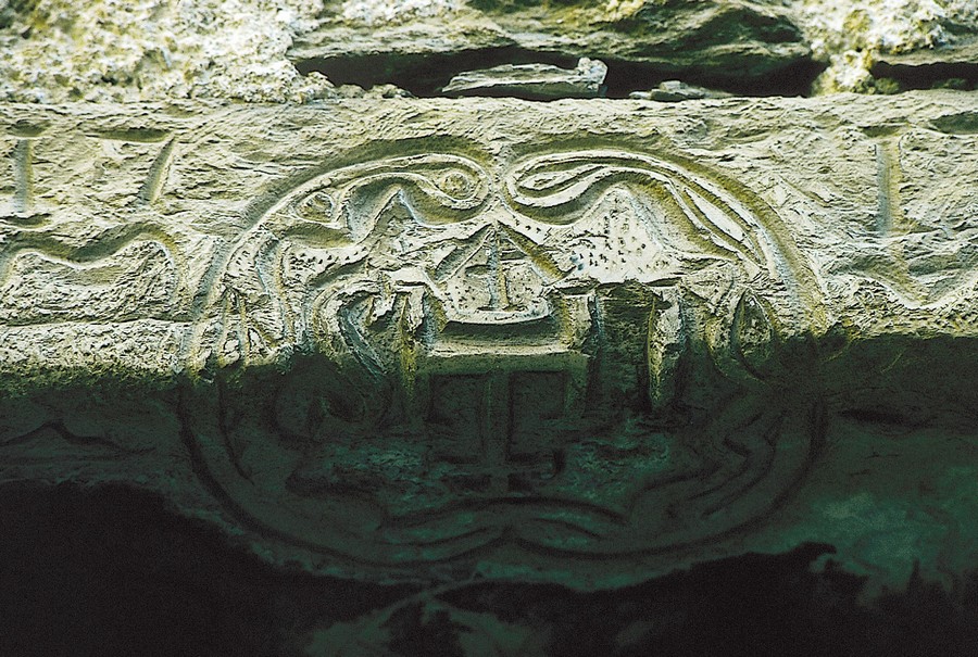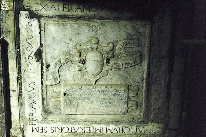 Nella bussola d'ingresso alziamo gli occhi alla volta dove c'è un primo esempio dell'opera dei lapicidi, una lapide intagliata a Trigramma.