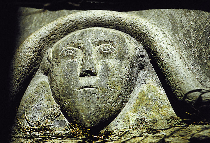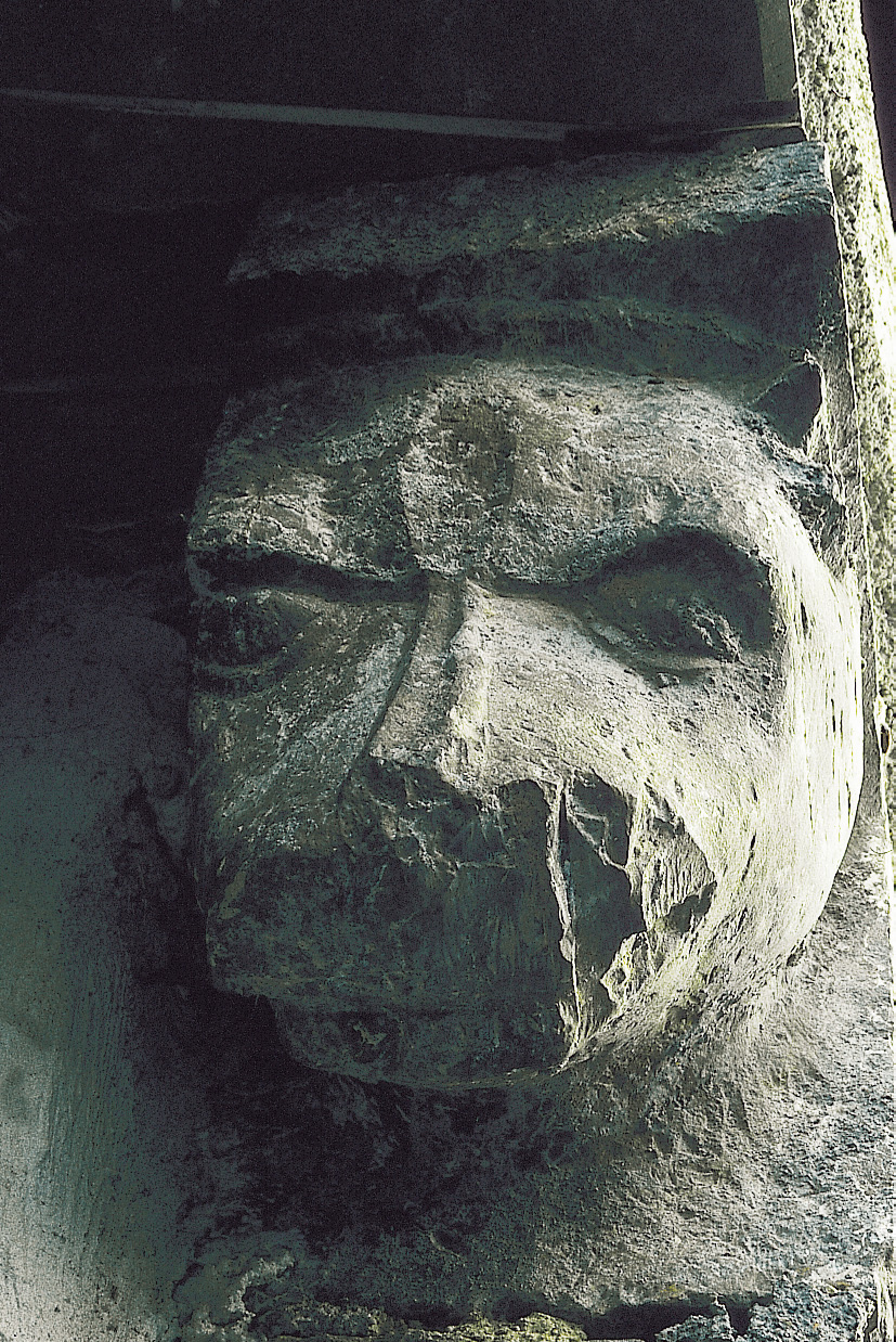 Discesi al paese, giunti alla casa con lunetta sul portale poco prima della chiesa voltiamo a destra e superato a destra il portale ad arco ogivale in pietra raggiungiamo il fianco della chiesa da cui voltiamo a destra per via Cavour; prima di passare sotto l'archivolto, alziamo gli occhi a destra per incontrare quelli del mago-custode intagliato nel monolite di recupero che funge da balaustra alla scala sovrastante.