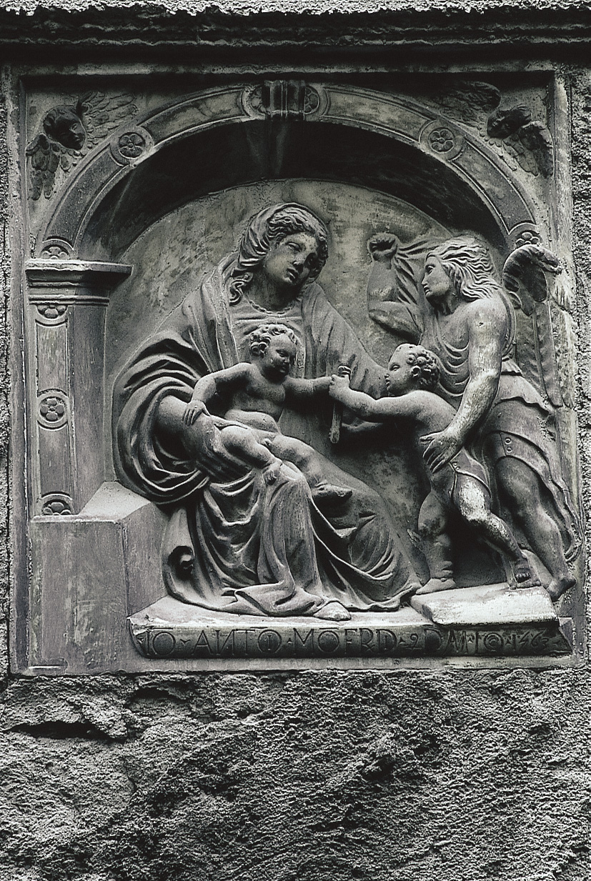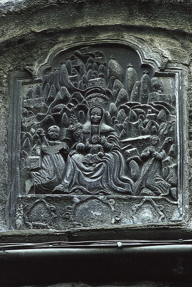 Sul lato opposto della strada sale la rampa che ha a sinistra la fontanella con edicola e statua della Vergine, seguita dal portale della canonica con architrave intagliato con Trigramma, le iniziali R D e la data 1516, e divisa fra i due stipiti la data 1571.