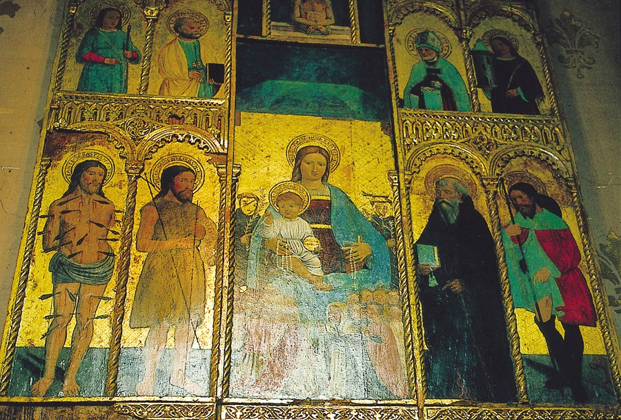 In chiesa sono conservati a sinistra il polittico "Storie della vita di Sant'Antonio da Padova" e a destra la tela "Santa Caterina" entrambi anonimi, in grandi e massicce cornici lignee cinquecentesche riccamente intagliate a tempietto; a sinistra dell'altare maggiore c'è l'anonimo polittico con fondo in oro "Madonna con Bambino e Santi".