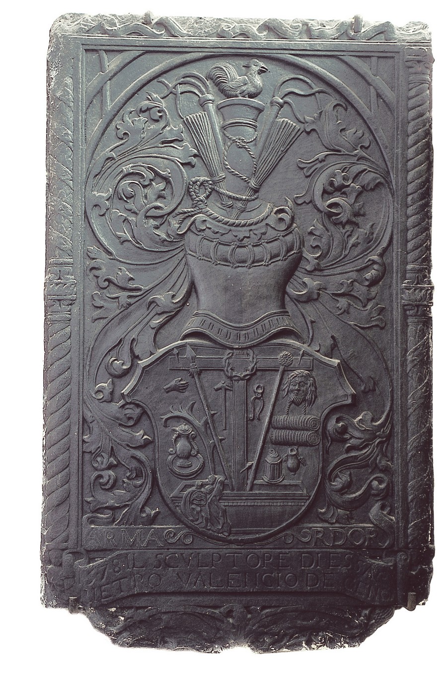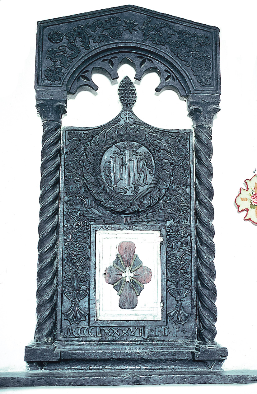 Nella sacrestia sono murate due splendide lapidi: la prima del 1486 intagliata a Trigramma fra ricchissimi delicati motivi floreali; la seconda con scritta "ARMA RDOR 1578 Scultore di essa Pietro Valencio de Ceno(va)" riproduce una finissima testa del Cristo ed elementi della Passione (i trentatrè denari, mantello, tenaglie ecc.) sormontati da un gallo e contornati da accurate decorazioni.