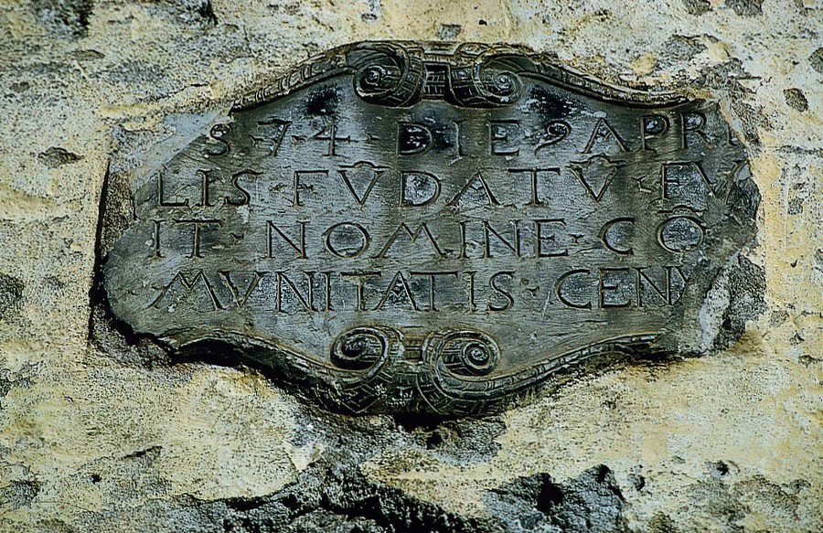 Usciti dalla chiesa riattraversiamo il sagrato che conserva agli angoli bei rocchi di colonna della chiesa originaria e prendiamo la bassa stradina a sinistra; superato sulla destra il portale con scalinata semicircolare e l'altro del 1555 finemente intagliato, possiamo arrivare fin oltre il voltone dove c'è a destra un sovrapporta monolitico a lunetta.