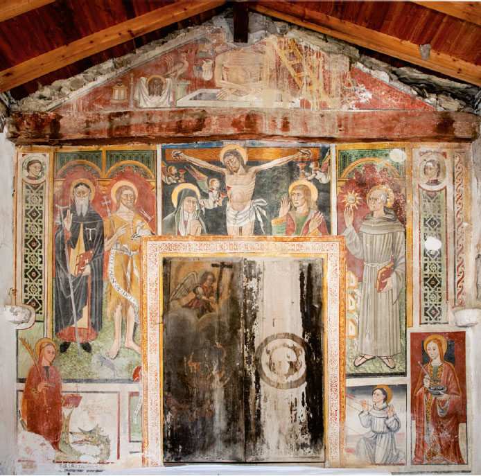 La parete di sinistra è interamente bianca, mentre quella di destra e quella di fondo sono decorate da un ricco ciclo di affreschi fra cui "I sette peccati capitali", "L'Inferno e le pene", il deteriorato "Purgatorio" e in basso "Il lavoro nei campi".