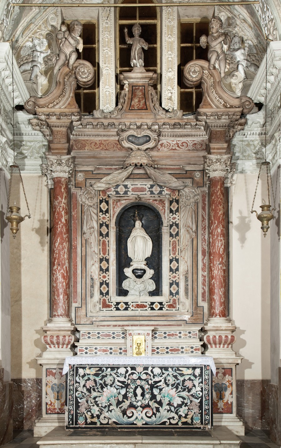 Nell'abside è conservata l'arcaica nicchia in pietra con archetti pensili nel basamento che ospita la statua del santo; nella parete di destra vicino all'abside c'è una ricca tomba trecentesca, probabilmente di un Ventimiglia, con tettuccio su grande arco in pietra nera.