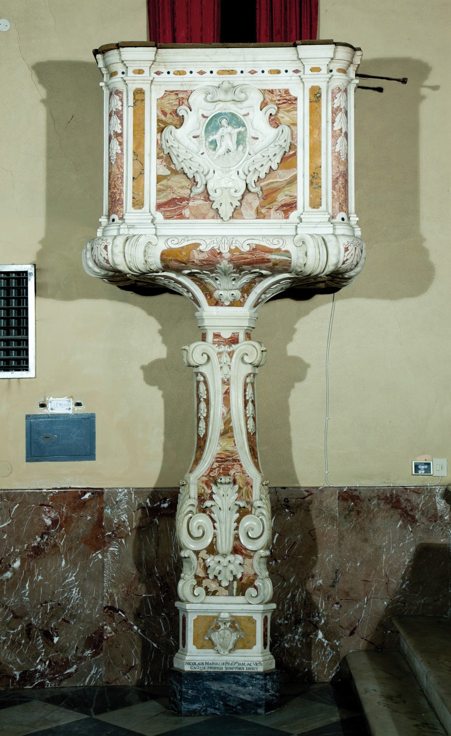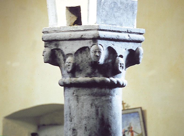 Parcheggiata l'auto nello slargo a destra a inizio paese, saliamo a piedi a raggiungere la seicentesca chiesa di San Bernardino da Siena osservando come a far da ciglio al sagrato e sotto il voltone che la fronteggia siano distribuiti capitelli e rocchi di colonna della originaria costruzione medievale. Dietro alla chiesa c'è il bel portale in pietra nera della casa natale dell'architetto Giovanni Francesco Marvaldi. A destra sgorga la fontanella con abbeveratoio sormontata da una bella scultura della Vergine e Bimbo, quest'ultimo però decapitato.