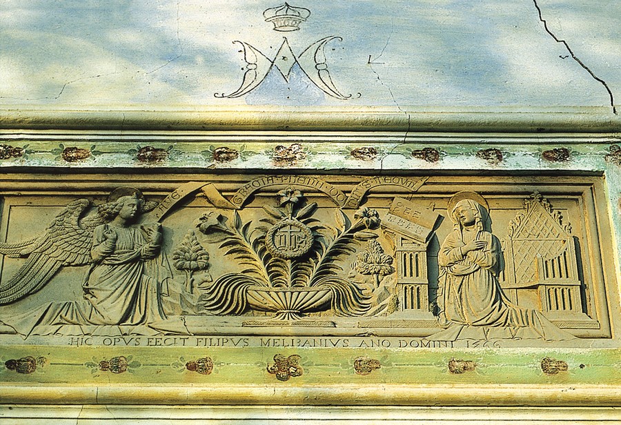 Avviamoci lungo la strada a sinistra passando così davanti alla cappella Melissano, dall'architrave scolpito con una bella "Annunciazione" da Filipus Melibanius nel 1566; procedendo fra case in stato di abbandono arriviamo all'incrocio con a destra la fontanella e di fronte, al civico 129, un portale con architrave del 1596 intagliato con Trigramma e scritta: "IN TE DOMINE CONFIDO", da cui a sinistra torniamo alla chiesa e quindi all'auto.