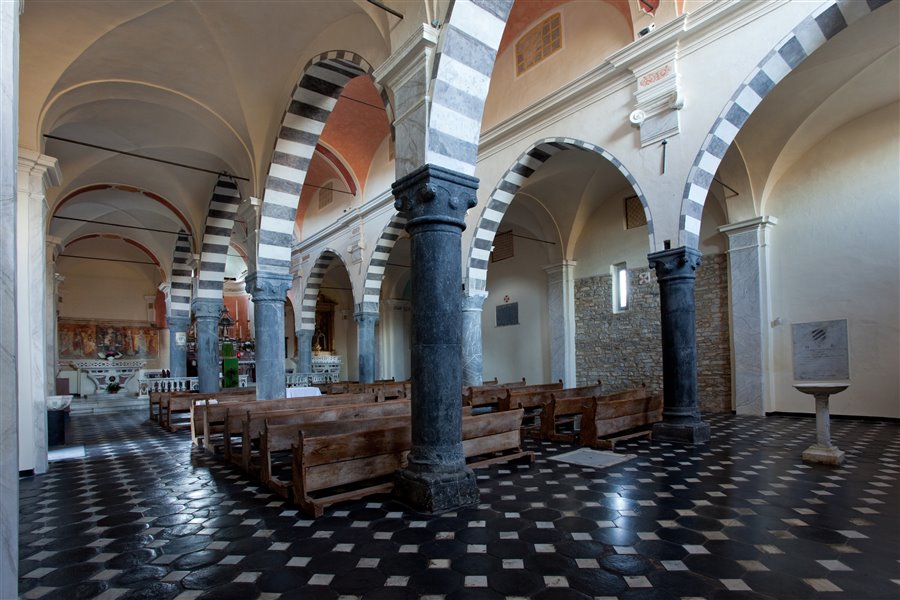 Giriamo attorno alla chiesa per osservarne, dalla monofora strombata che si apre sul fianco destro, l'interno dalla classica struttura quattrocentesca a tre navate, con basse colonne, basi e capitelli in pietra nera di cui uno intagliato con numerosi maghi-custode, archi gotici a fasce bianche e nere; vi sono conservati un anonimo affresco della Vergine con Bambino, un architrave con lo stemma dei conti di Ventimiglia ed il tabernacolo in pietra nera del 1530 a destra dell'altar maggiore. All'interno si conserva il polittico dei santi Nazario e Celso opera di Raffaele De Rossi (1525).