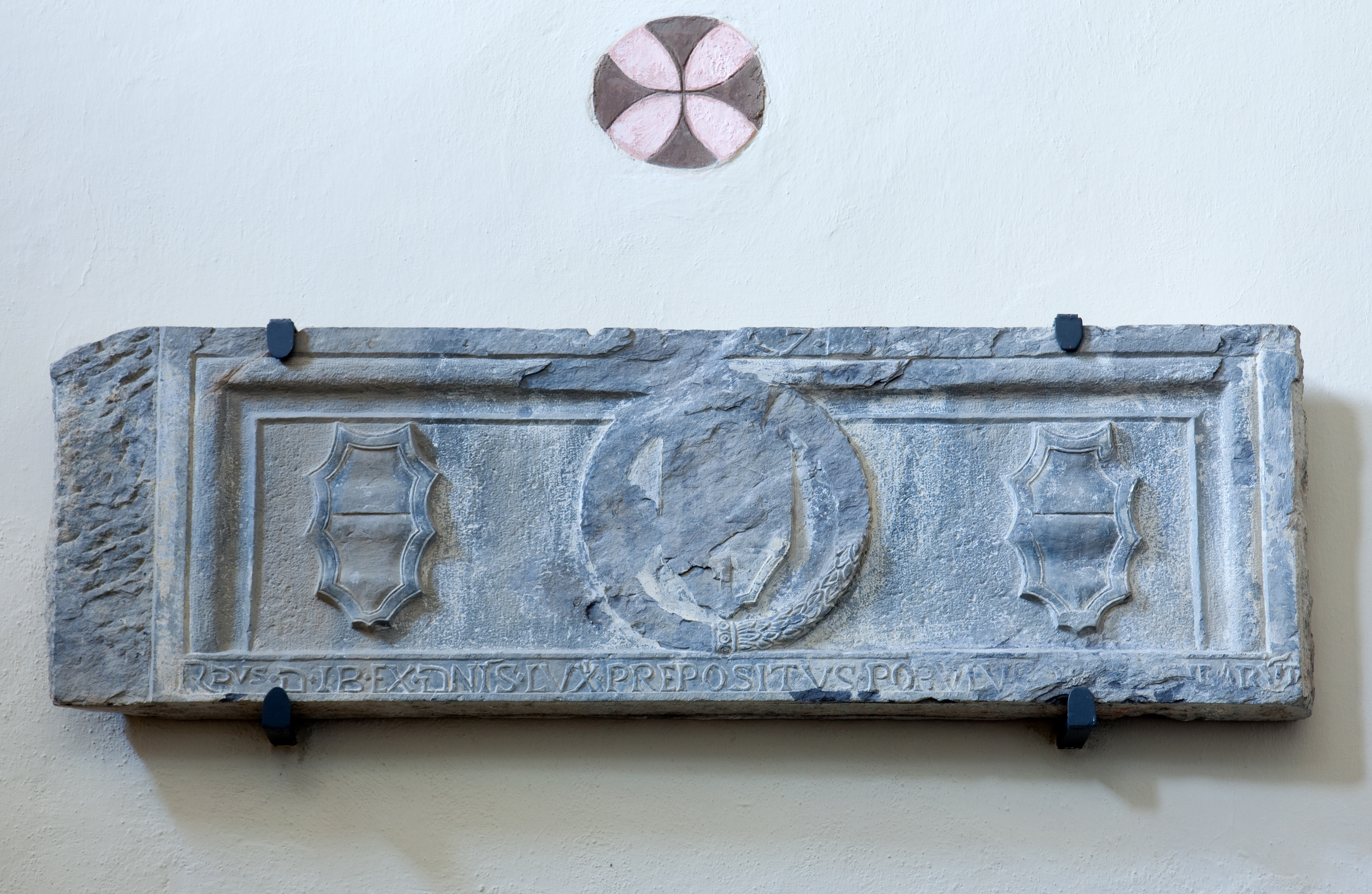 Continuando a scendere per la stretta gradinata, giunti all'incrocio con la via lastricata a cubetti di porfido prendiamo a destra per andare a vedere al civico 12 il bel portale in pietra nera con stipiti monolitici e tettuccio su mensole, con sovrapporta in parte corroso; tornati alla discesa e superato il portale in pietra nera e architrave con stemma abraso e scritta: "GRATIA CONCEDITUR USU" a sinistra al civico 8, giunti all'incrocio con la lastricata via Merano prendiamo a destra per andare a vedere murata sopra il 60 una lapide intagliata con Trigramma tra decori floreali.