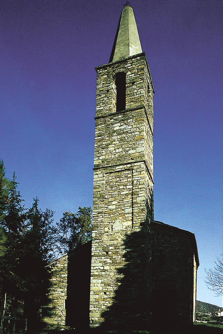 La chiesetta originaria venne qui eretta nei primi secoli del Cristianesimo; l'attuale struttura vi fu sovrapposta nel 900 d.C. e poi ampliata nel Quattrocento, quando venne realizzato anche lo splendido portale della facciata in pietra nera del 1498 con decorazione a treccia ed architrave scolpito con una "Annunciazione" ed un Trigramma in raggiera sorretta da angioli. Sul fianco sinistro sotto il campanile si apre il bel portale quattrocentesco della porta laterale, con architrave intagliato a Trigramma, Agnus e stemma del Gran Bastardo di Savoia, Signore del Maro nella prima metà del Cinquecento.