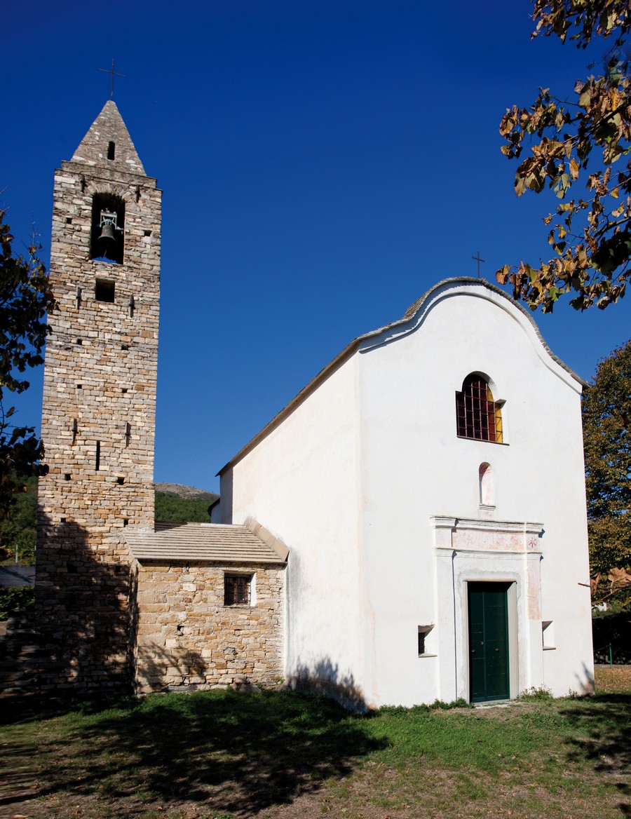 Originario fino alla campana è anche il bel campanile in conci ben squadrati a regolari corsi orizzontali, sul lato di ponente è rimasto l'arco della porta sormontato da quello di una alta e stretta bifora, entrambi ora murati, mentre verso valle la feritoia rivela l'uso anche militare della struttura. Il campanile era una delle torri di avvistamento del Castello dei Conti di Ventimiglia, l'altra, La Colombera, quasi completamente distrutta e sul costone verso Poggialto.