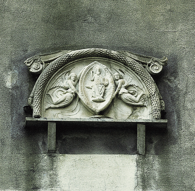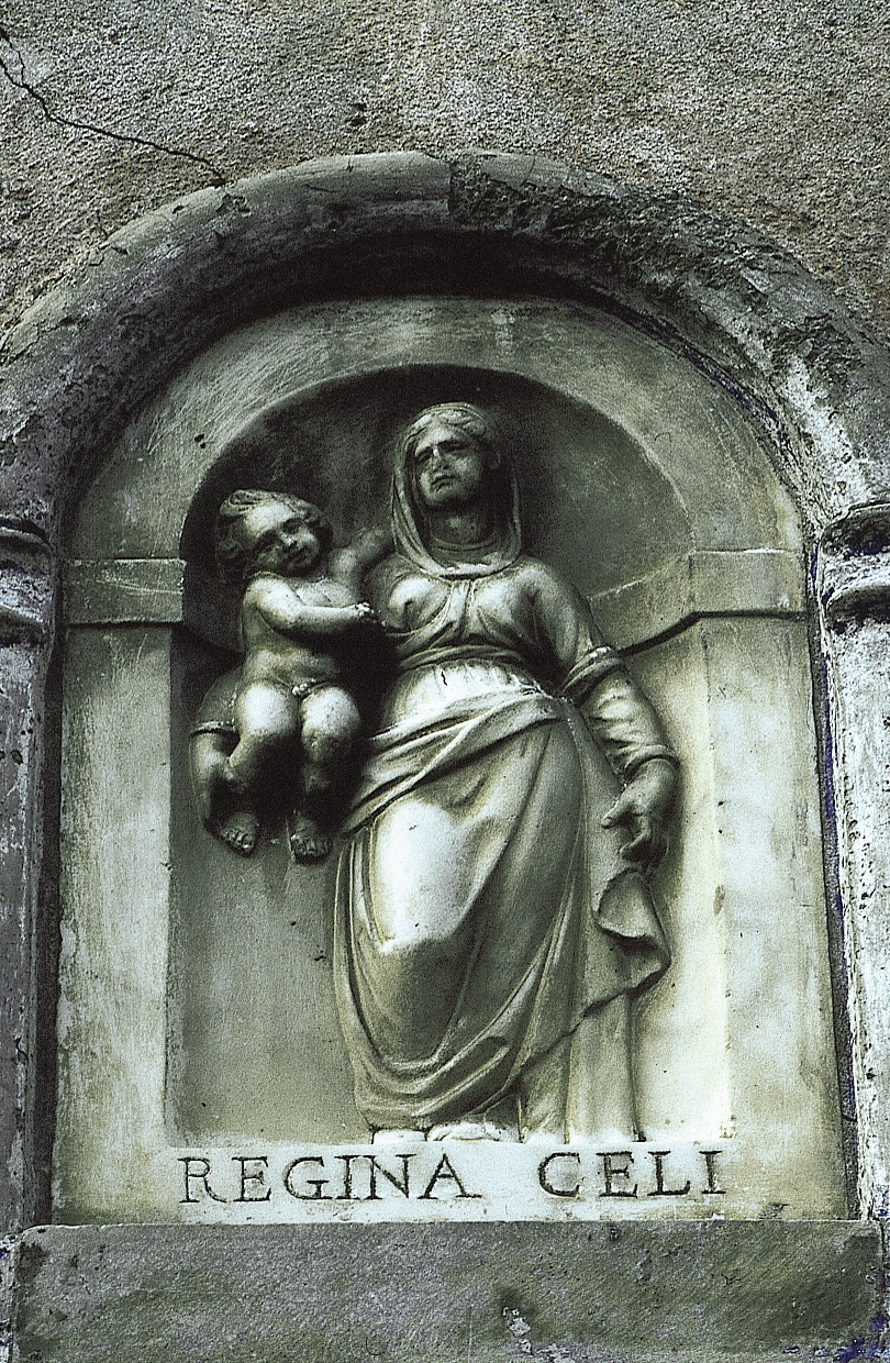 Scendendo la gradonata, superato a sinistra il portale in marmo del 1622 con Trigramma e le iniziali R.B. del lapicida sbocchiamo in via Oratorio, da cui vediamo sul poggio di fronte a noi il Santuario della Madonna delle Vigne che visiteremo fra poco e, pochi metri alla nostra sinistra, il bell'altorilievo della Vergine con Bimbo e la scritta "Regina coeli".