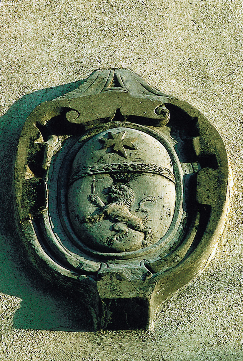 Scendiamo a sinistra della fontanella e alla fine della discesa procediamo a sinistra fino a raggiungere, sotto il volto a sinistra, il fianco dell'arcaico palazzotto padronale su cui si apre il grande portale a massici monoliti ad arco romanico, con chiave di volta intagliata a stemma araldico poi abraso, ed una finestra a stipiti monolitici ora murata; sulla facciata, sopra l'architrave in legno della porta, c'è una lapide trapezoidale intagliata con immagini ormai dilavate ma ancora ben leggibili della Vergine con Bimbo in un tondo retto da angioli.