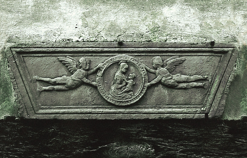 Tornati indietro all'edicola scendiamo la gradonata in mattoni fino all'archivolto a destra, sotto cui è murata una bella edicola in pietra nera con lapide che recita: "O VOI CHE PASATI DE QUAVIA - SALUTATI CON PIETA'IESU MARIA" che ha tutta una sua storia, a cominciare dall'errore del lapicida, che nell'incidere dimenticò la "R" di "MARIA" e tentò poi di rimediare in qualche modo.