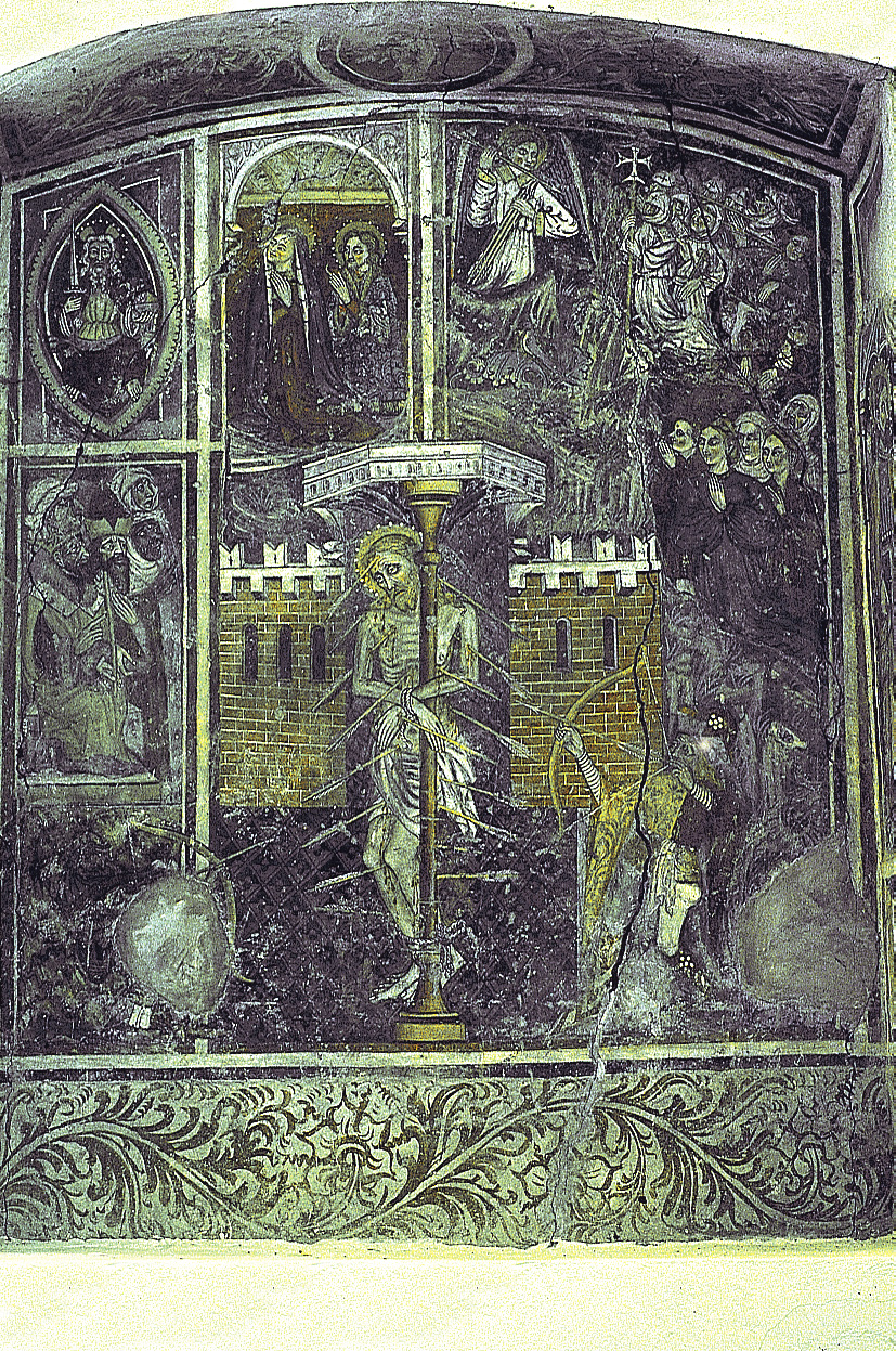 Poco oltre si apre la nicchia con affresco "San Sebastiano", del 1457; decorate da affreschi, tutti del Canavesio, sono anche le lunette degli altari e del presbiterio.