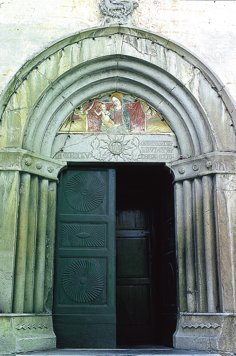 La lunetta, affrescata con la "Madonna e Bambino" di Giovanni Canavesio, è sormontata da una lapide in pietra nera intagliata con Agnus e dal piccolo rosone; il sottotetto è decorato da archetti pensili, verticali nella parte centrale ed inclinati nelle due laterali.