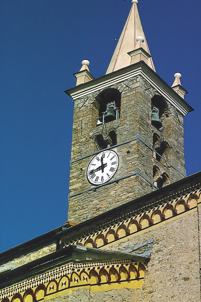Il campanile in pietra è un'antica torre riciclata che risale al Millecento: presenta nella parte inferiore due alte feritoie, sormontate da due bifore su cui si apre la monofora della cella campanaria; poco discosto dal campanile c'è il vecchio oratorio ormai in abbandono, in parte costruito sopra un voltone che scavalca il sottostante ruscello.