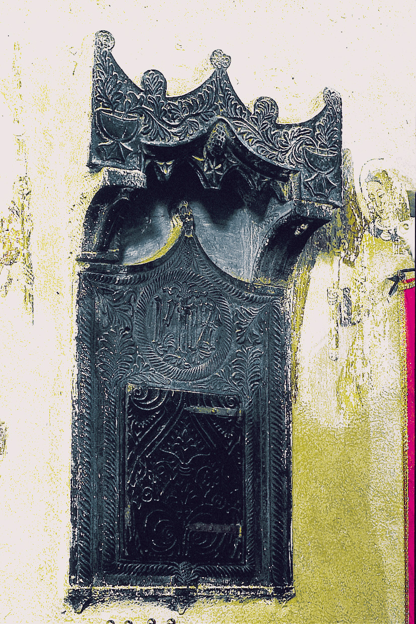La copertura dell'abside è affrescata con Storie della Passione; a sinistra dell'altar maggiore è murato il ricco armadietto in pietra nera per gli oli santi.
