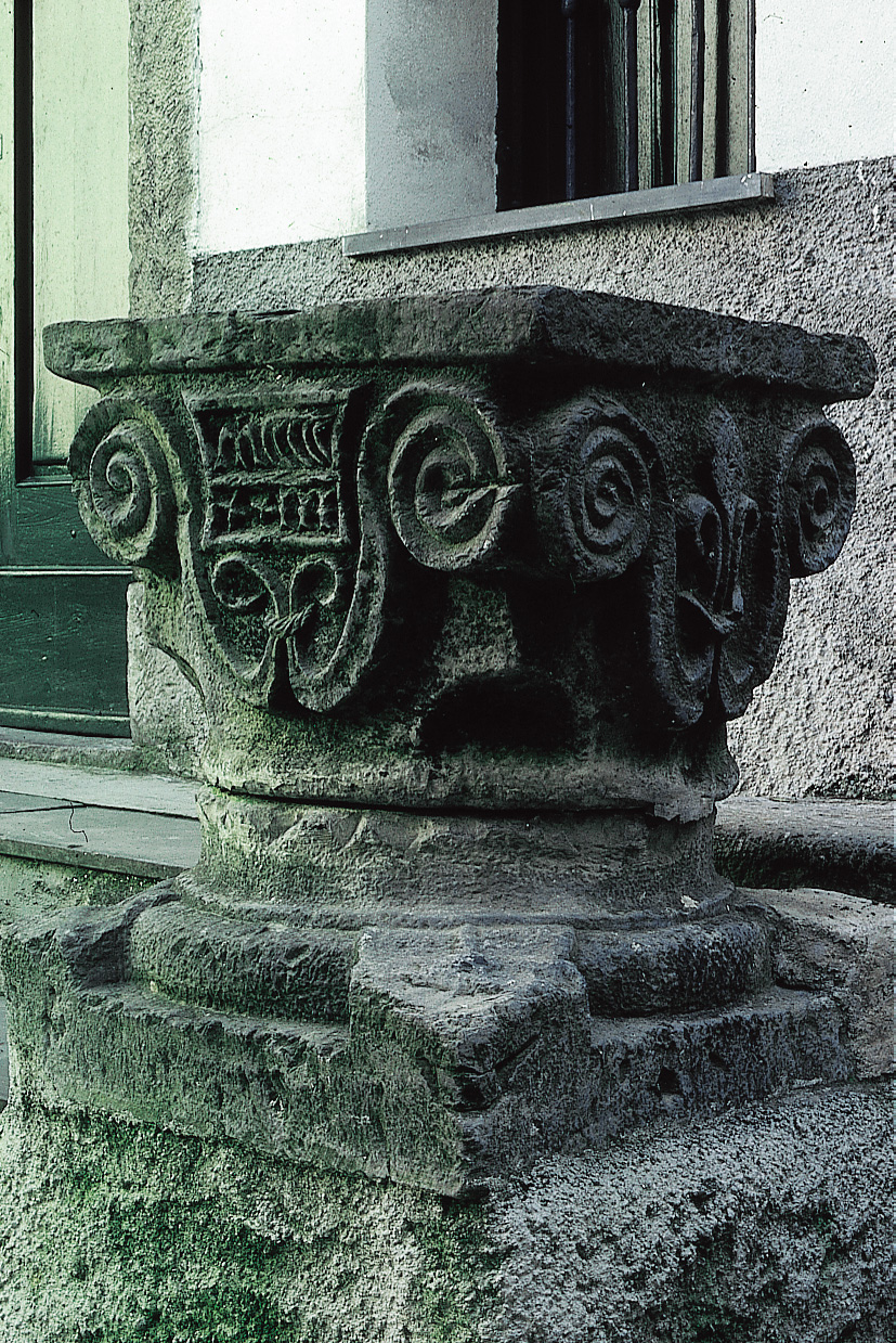 Subito dopo la loggia si apre un altro portale ad arco tondo del 1447 (dove il 7 è ottenuto con altrettante barre anziché col romano VII); la scritta che corre lungo l'arco - opera del "Magister" Anthoni Brighensis - utilizza caratteri stilizzati e trasformati in decorazione che la rendono inintelleggibile nella parte centrale.