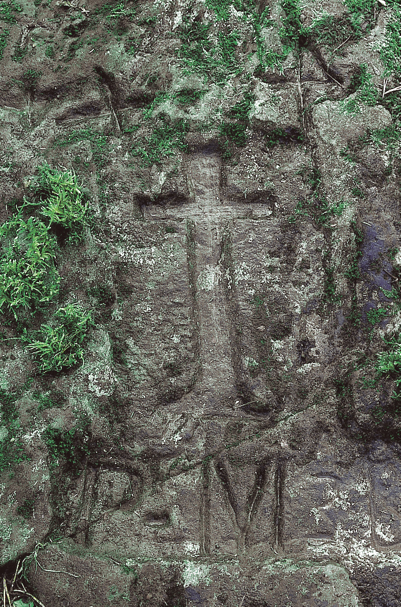 Lasciamo l'auto e scendiamo la scarpata a destra per una quindicina di metri fino a raggiungere sotto i castagni l'ampia roccia pianeggiante di poco emergente dal terreno che porta incisa, a circa un metro dal lato che dà verso la strada, una scritta lunga una quindicina di centimetri solo parzialmente leggibile che può essere interpretata come "P – M 3 b 1.9"; soprattutto la scritta è accuratamente scalpellata per la profondità di un centimetro una croce lunga una ventina di centimetri circondata da altre croci assai più piccole, semplici e superficiali.