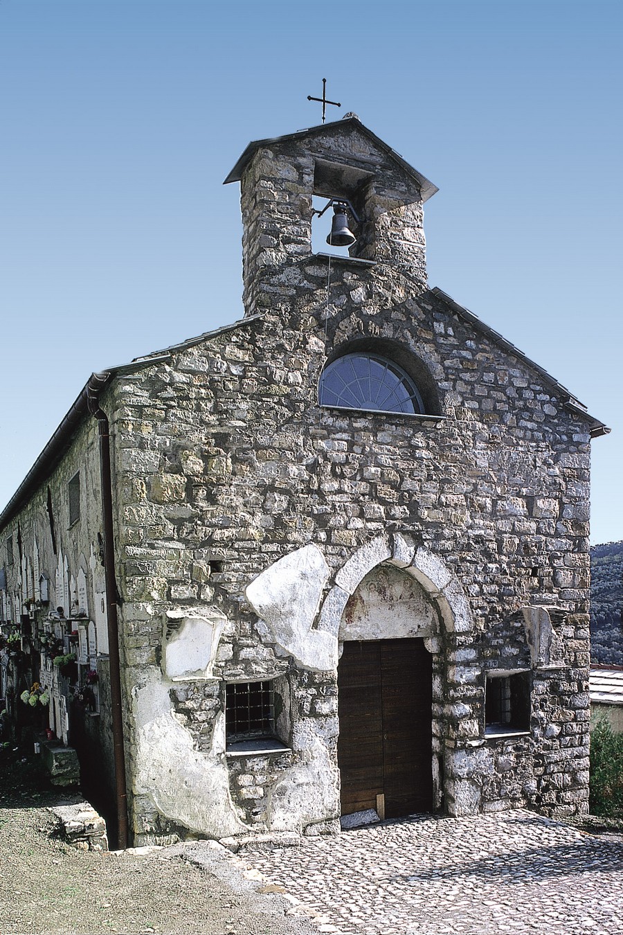 Nella facciata a capanna si apre il portale ad arco ogivale in grandi conci di pietra scolpito nella chiave di volta con un rozzo Agnus, mentre la porta a sinistra ha come architrave un nudo monolite irregolare; il basso campanile decorato con archetti pensili, monofora e gli stemmi dei conti di Lengueglia è originario solo nella sua parte più bassa: la guglia fu rifatta nel Seicento.