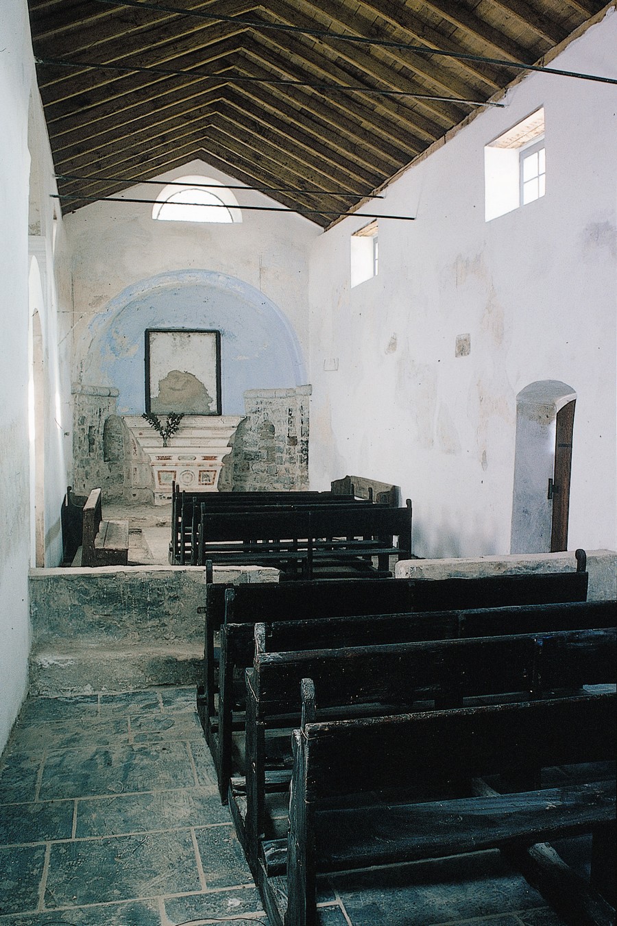 Lo spoglio interno, ben visibile dalle due finestrelle quadrate in facciata, è a navata unica coperta a capriate, pavimentata in grossolani lastroni di pietra; il classico muricciolo con sedili in pietra ne separa lo spazio per i fedeli da quello, più lontano dall'altare, riservato ai catecumeni.