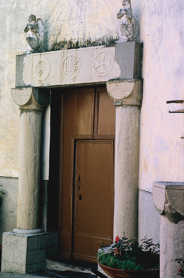 Due colonne reggono l'architrave monolitico sormontato da due angioli ed intagliato con Trigramma gotico tra una stella e una croce; all'interno della chiesa è conservata una anonima "Madonna del Rosario" del 1653.