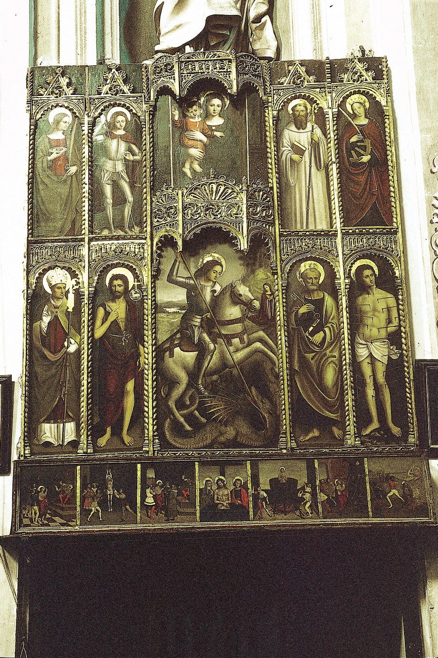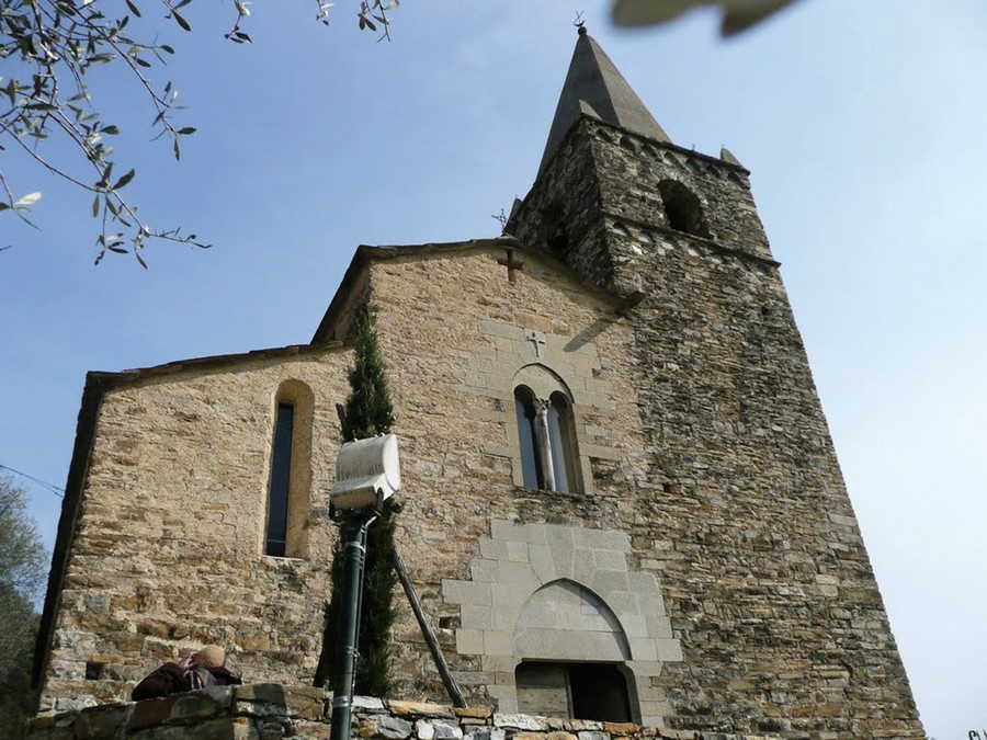 Arriviamo così al sagrato della chiesa di San Giovanni Battista e San Giorgio, fondata nel 1407 e ristrutturata nel 1618, che oltre al bell'organo di Antonio Grinda del 1810 conserva all'interno il polittico dorato, trasferitovi dalla chiesa omonima, "San Giorgio con altri santi" del 1516 di Ludovico Brea, con storie di martiri nella predella; la cimasa (la parte superiore del polittico) venne trafugata da Napoleone ed è oggi conservata al Louvre.
