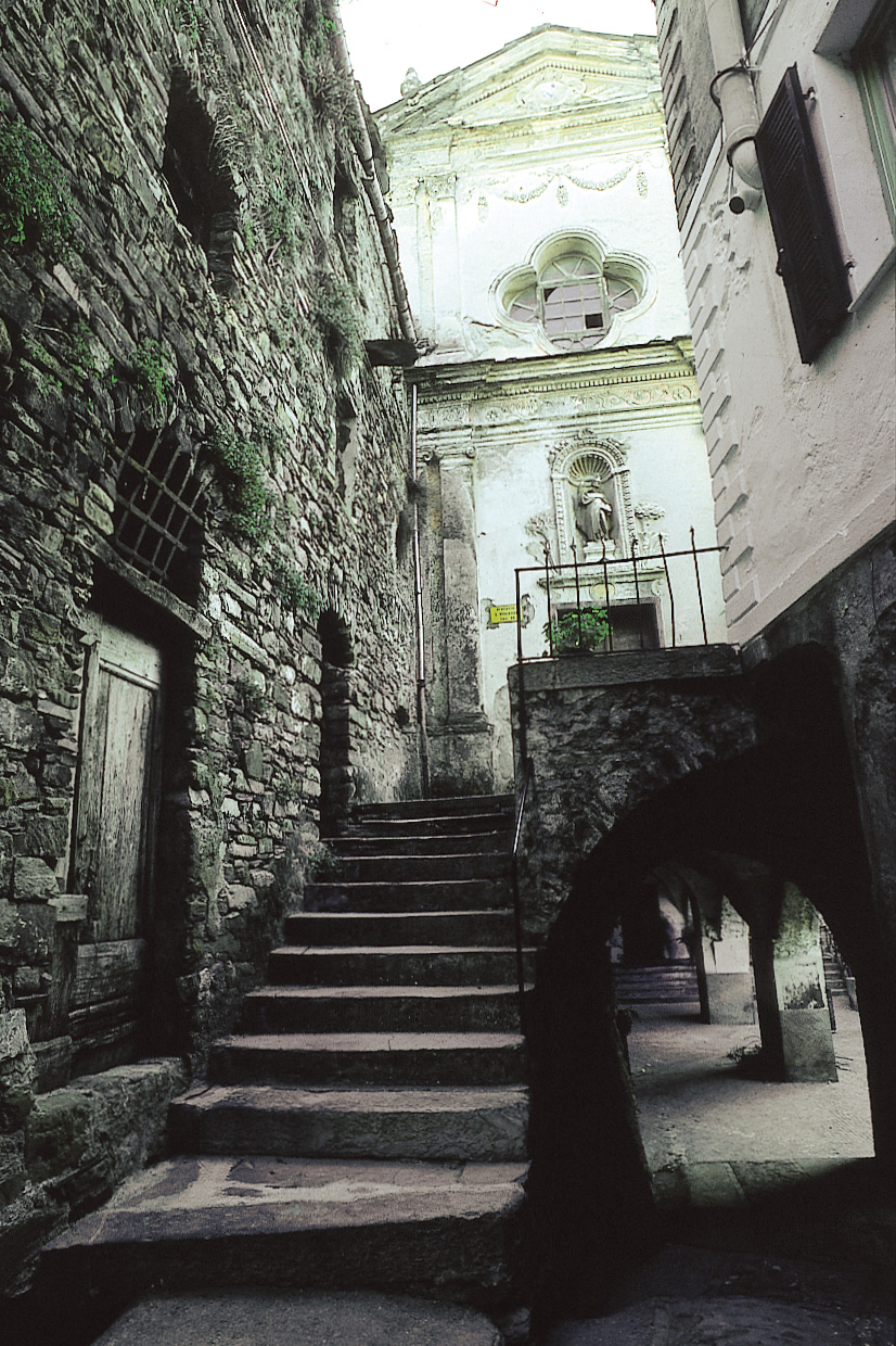 Arriviamo così al piccolo slargo che ci offre uno scorcio sui tetti a "ciappe", terrazzini con pergolato a vigna e scale in pietra del borgo; scesa la ripida scalinata con a destra piccoli orti torniamo sulla carrozzabile avviandoci a sinistra.