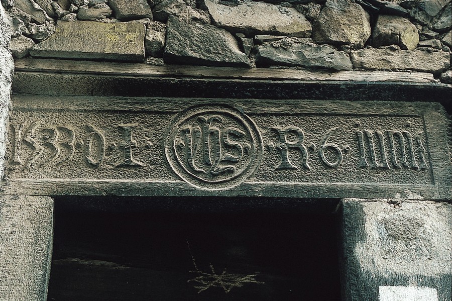Procedendo a sinistra sotto il voltone, superata la fontana con abbeveratoio in consunta pietra nera troviamo a sinistra, murati in una casa restaurata, due architravi decorati: il primo è del 1618, scolpito a Trigramma e lettere B A; il secondo, del 1655, è più piccolo e più decorato, intagliato a Trigramma in un doppio ovale col funereo "MEMENTO MORI" (Ricordati che devi morire).
