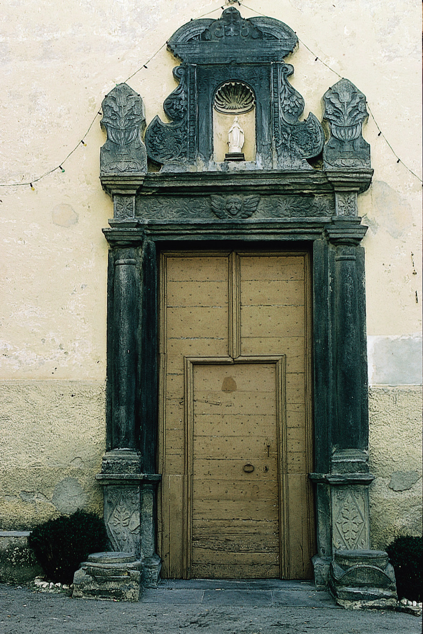 Il portale in pietra nera è decorato al centro con una testa d'angiolo sormontata da una ricca edicola con statua della Vergine; gli stipiti, intagliati in basso a motivi floreali, sono poi lavorati a semicolonna.