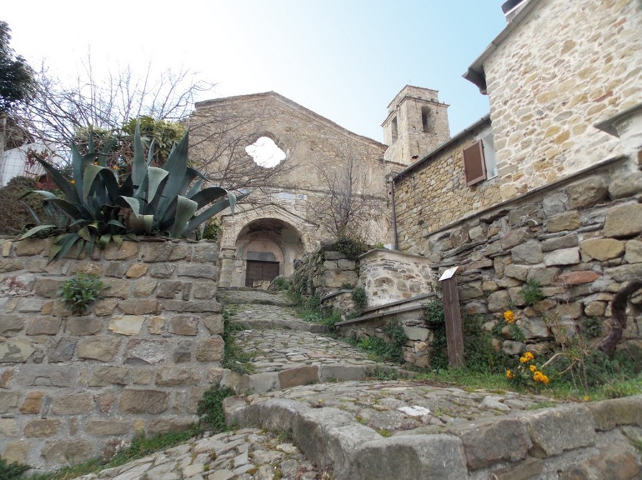 Tornati alla provinciale prendiamo la strada che scende su Apricale; poco prima di arrivare all'abitato se ne distacca a destra la deviazione che ci porta al parcheggio presso il camposanto.