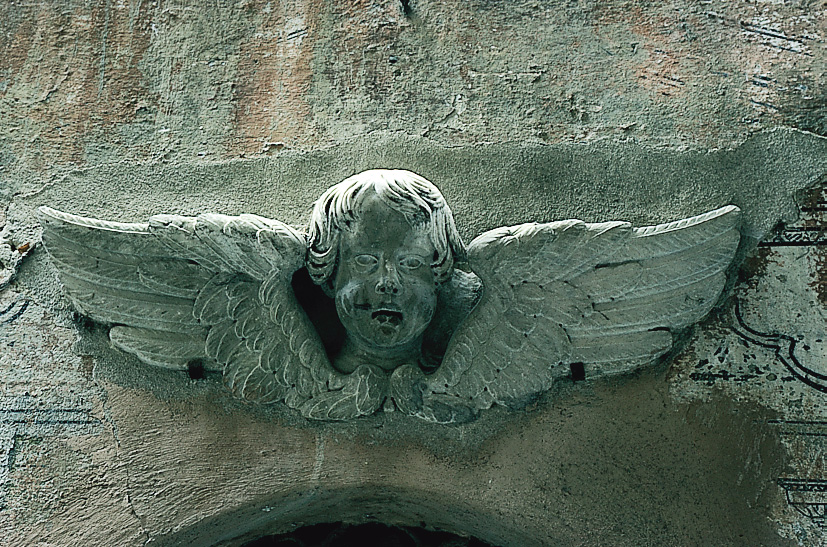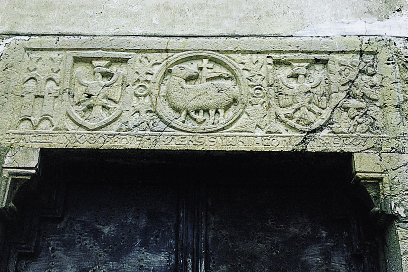 L'analogo più grande architrave della porta centrale è finito murato in verticale nel muricciolo a destra che regge la gradinata; mutilo della parte destra, conserva l'Agnus al centro e l'aquila dei Doria a sinistra, entrambi col solo muso abraso a parziale esecuzione degli editti napoleonici.