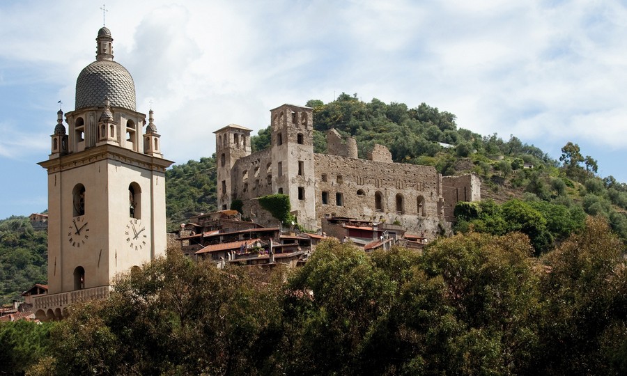 Ripresa l'auto raggiungiamo il borgo, che ci offre la vista dell'intatto nucleo medievale dominato dal castello ed arricchito in basso dall'elegante arco del ponte. Svoltiamo a destra in corrispondenza della radice del ponte medievale immediatamente prima del monumento ai Caduti e passando a sinistra della chiesetta scendiamo al parcheggio. Da qui vediamo in alto il castello sulla roccia a strapiombo su di noi, a destra il ponte, di fronte il borgo medievale e a sinistra le vigne del ben noto vino Rossese.