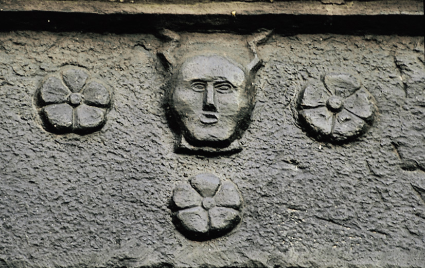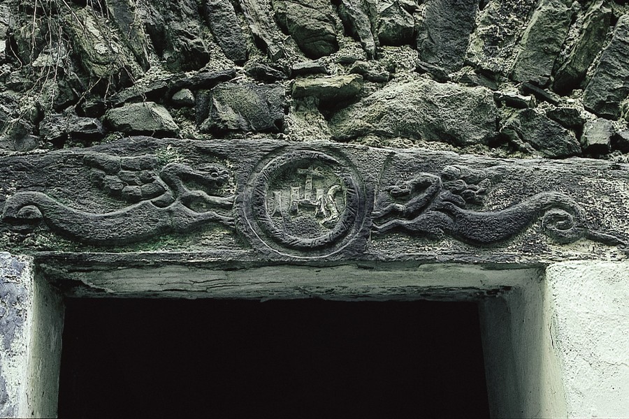 Avviamoci nel vicoletto Santo Stefano a sinistra della fontanella alla base del campanile; dopo il portale in marmo decorato a rosette del civico 3 c'è al civico13 un bell'arcaico bassorilievo in pietra nera, in parte dilavata, intagliato con un Trigramma centrale conteso fra due chimere.
